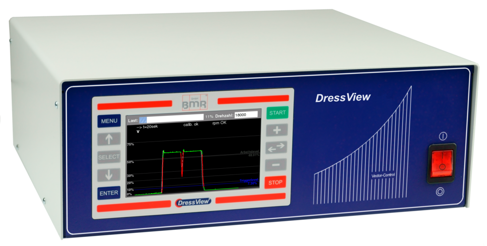 This dressing systems this worlds first which works without sensors and has the advantage that it does not require any sensors in the spindle and therefore cheaper spindles can be used for dressing. DressView ® is offered together with a drive in a desktop case as an integrated solution or as stand-alone solution as a separate system, which lends itself particularly for use in the control cabinet. (Here the frequency converter and a docking station for the DressView ® is then installed.) The signal derived from the operation of the spindle is graphically displayed on an LC-display. For signal output to the PLC in each case a limit value for signal detection and, in addition, a higher can be set to a potential crash detection. When the limit is exceeded, the measurement signal is dyed red and a corresponding output connected. The DressView ® system is via laterally arranged foil keys with switching point very easy to operate and adjustable. Various settings can be made for the dressing process, such as the afterglow of last measurement processes as silhouettes, the time base of the representation or the scaling of the display. For communication with the PLC 3 digital inputs, 3 digital outputs and one analog output are available. Via them the system can be started and the current status are displayed. The analog output is directly from the measurement signal of the dressing. Tests shown that the sensibility and sensitivity with the established sensor- based process is on an equal footing. In experiments a dressing accuracies of under 0.5 micron were realized.