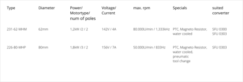 Type Diameter Power/ Voltage/ max. rpm Specials suited Motortype/ Current converter num of poles 232-80-MHP 80mm 2,6kW /3 / 4 182V / 11,5A 40.000U/min / 1333Hz PTC, Magneto Resistor, water cooled, pneumatic tool change, inductive tool change control 227-80-MHM 80mm 2,6kW /3 / 4 182V / 11,5A 40.000U/min 1333Hz PTC, Magneto Resistor, water cooled