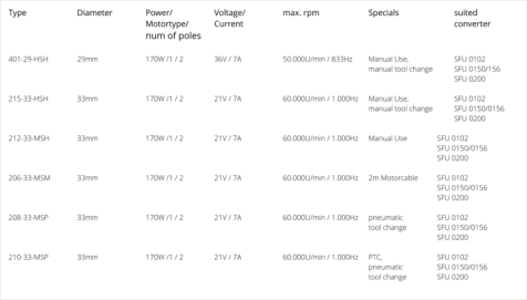 Type Diameter Power/ Voltage/ max. rpm Specials suited Motortype/ Current converter num of poles 401-29-HSH 29mm 170W /1 / 2 36V / 7A 50.000U/min / 833Hz Manual Use, manual tool change 215-33-HSH 33mm 170W /1 / 2 21V / 7A 60.000U/min / 1.000Hz Manual Use, manual tool change 212-33-MSH 33mm 170W /1 / 2 21V / 7A 60.000U/min / 1.000Hz Manual Use 206-33-MSM 33mm 170W /1 / 2 21V / 7A 60.000U/min / 1.000Hz 2m Motorcable 208-33-MSP 33mm 170W /1 / 2 21V / 7A 60.000U/min / 1.000Hz pneumatic tool change 210-33-MSP 33mm 170W /1 / 2 21V / 7A 60.000U/min / 1.000Hz PTC, pneumatic tool change